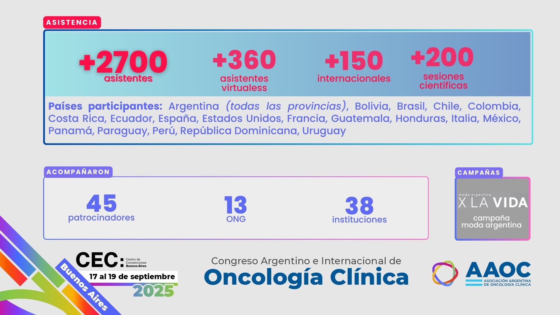 Congreso Argentino e Internacional XXVII Oncología Clínica 17 al 19 Septiembre 2025 Inicio Certificados Fotos Congreso Autoridades Institución Organizadora Invitados Programa Trabajos Contacto Nos vemos en septiembre 2027 Más información en www.aaoc.org.ar